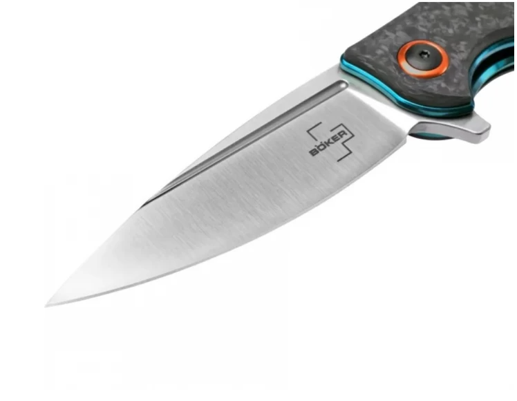 Boker Plus Nubilum — это универсальный EDC нож, пригодный для большинства повседневных работ. Листовидный клинок оснащён флиппером. Рукоять из карбона имеет мелкий красивый узор и отлично лежит в руке. Спейсер ножа имеет благородный лазурный цвет, осевой узел выполнен в чёрном цвете с оранжевой обводкой. Нож оснащён клипсой и темлячным отверстием.